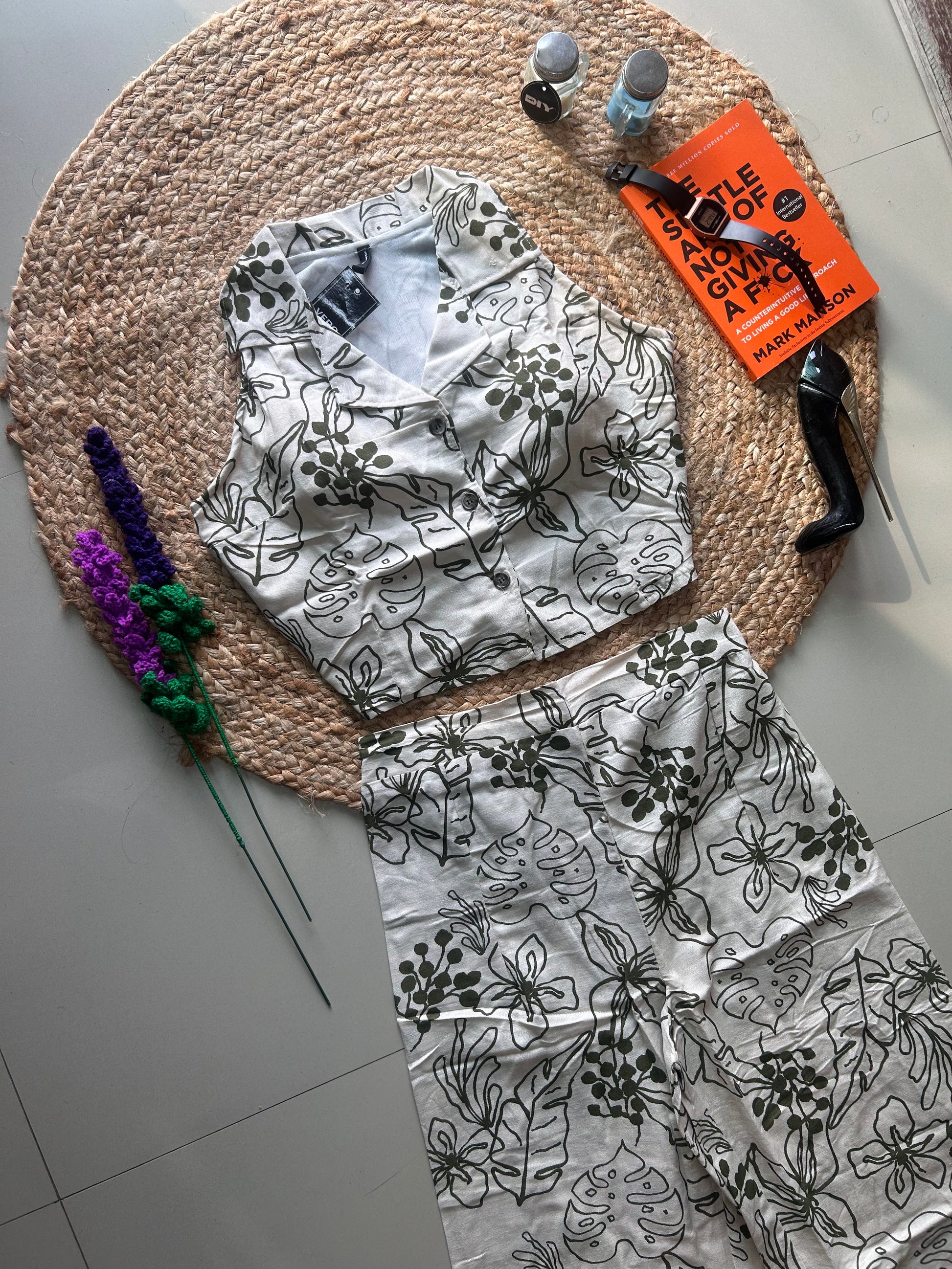 Beige Leafy Printed Co-ord Set for Women | Cotton Linen Boho Coord