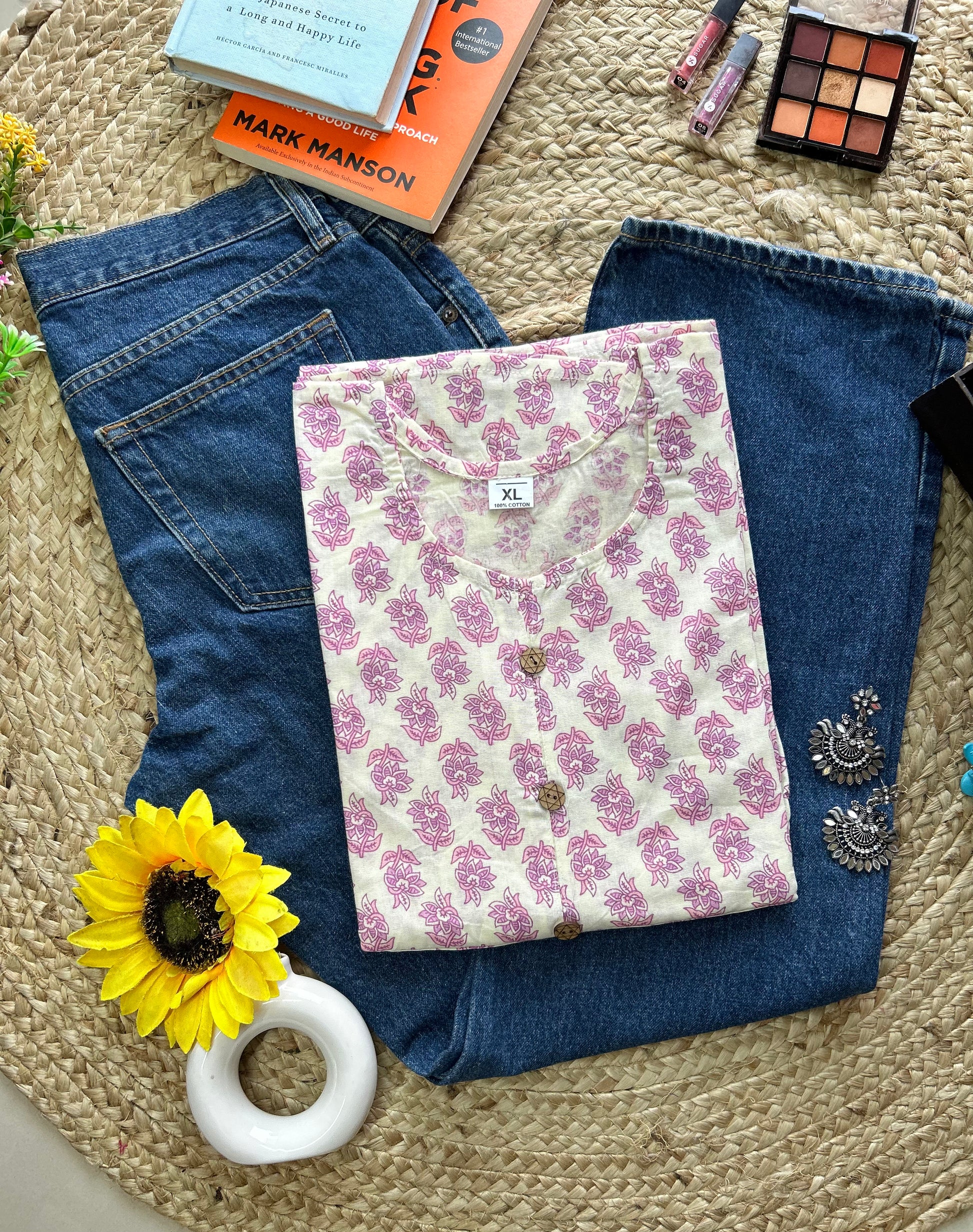 Material: 100% Cotton ;Sleeves:3/4th sleeves; Flared & comfort fit